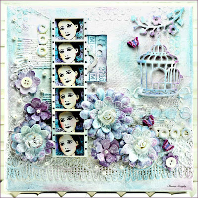 Also loving the colours here - I think Flo has painted everything white, with gesso I should think, and then re-coloured with paints and sprays perhaps. The repeating lady is from CI-238, and the film strip MDF laser cut can be found in the Must Haves section - Here.